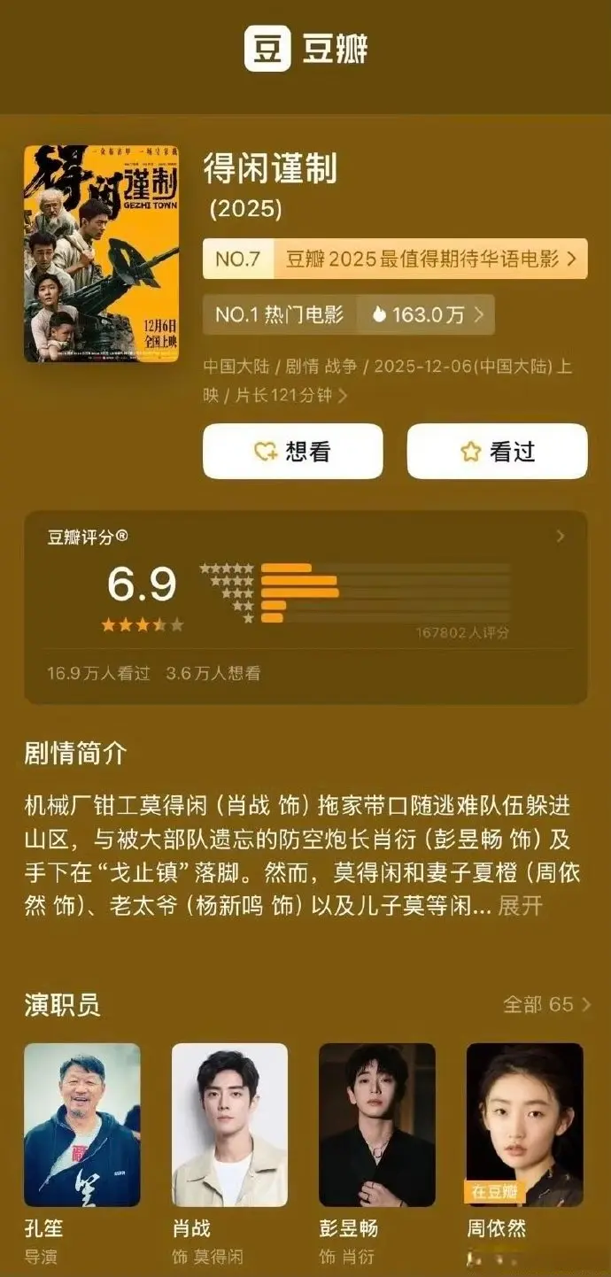 不过话说回来,虽然评分没达到预期,但《得闲谨制》的票房表现堪称“黑马”。上映两周票房超3亿,还在贺岁档多次实现逆跌,连93.1%的女性受众占比都打破了战争片的男性向惯性。肖战饰演的粗布衣衫钳工更是彻底打破流量偏见,灰头土脸的造型、地道的南京方言,被观众夸“把小人物演活了”。