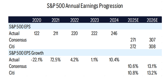 花旗自身的预测(272美元和308美元)也与此基本相符,显示出对企业基本面的信心。不过,报告也强调,市场需要年化约10%的EPS复合增长才能证明当前估值的合理性。