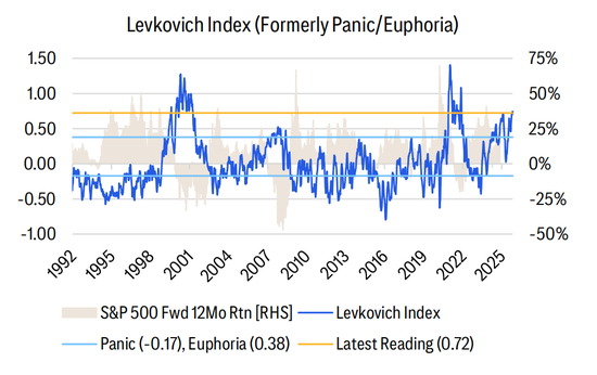 用来衡量市场情绪的花旗莱斯科维奇恐慌与亢奋指数(Levkovich Index)目前读数为0.72,显著高于0.38的“亢奋”标准。报告的历史回测数据显示,当该指数进入亢奋区域时,标普500指数接下来一年的回报中位数通常为负值(-9.4%)。